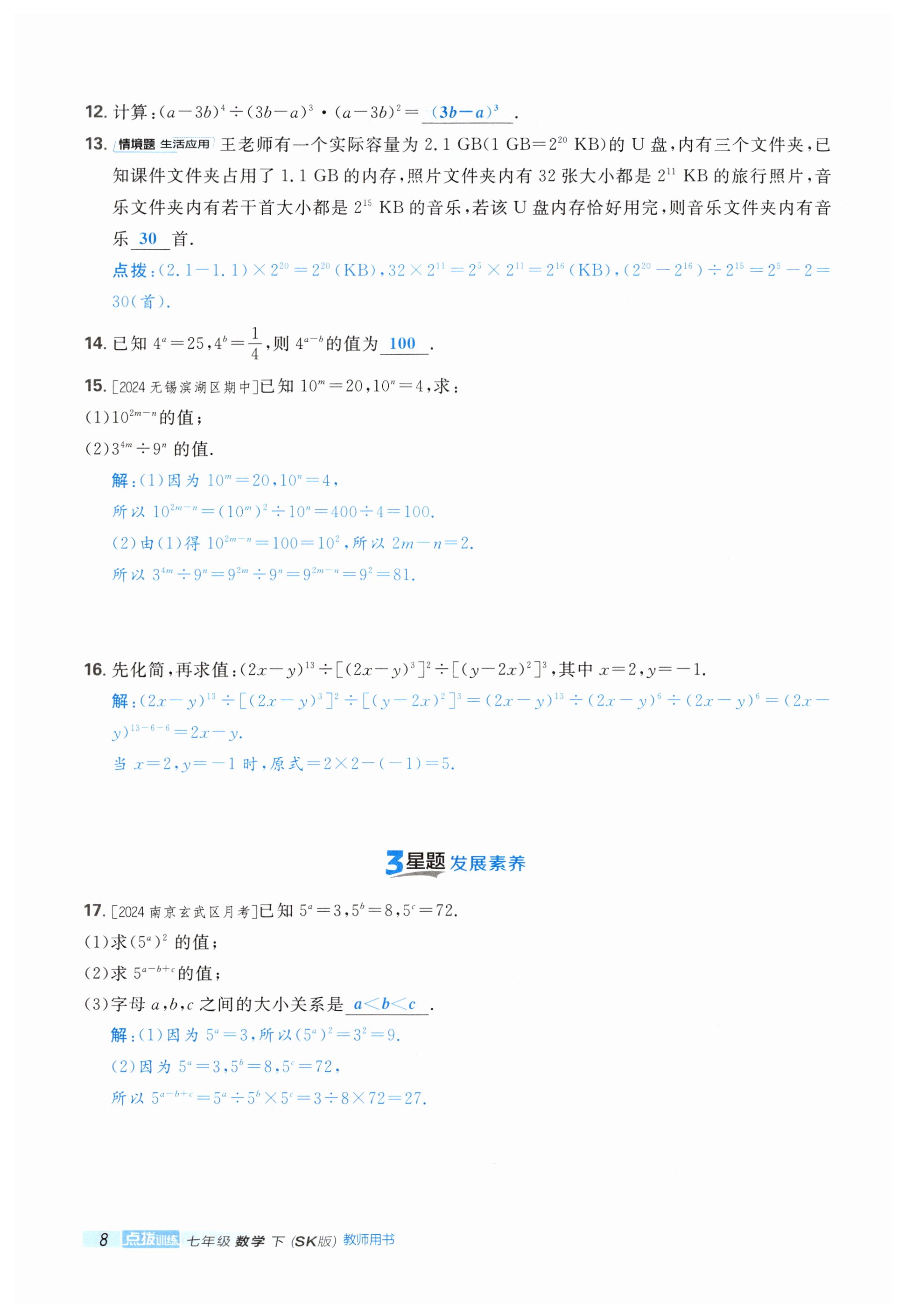 注:目前有些书本章节名称可能整理的还不是很完善,但都是按照顺序排列的,请同学们按照顺序仔细查找。练习册 2025年点拨训练七年级数学下册苏科版 答案主要是用来给同学们做完题方便对答案用的,请勿直接抄袭。