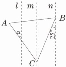 3.如图,直线$l// m// n$,等边$\triangle ABC$的顶点$B$,$C$分别在直线$n$和$m$上,边$BC$与直线$n$的夹角为$25^{\circ}$,则$\angle \alpha$的度数为( )