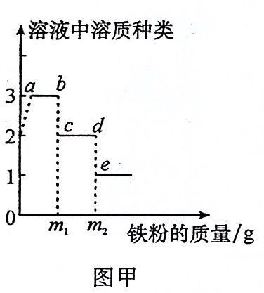 【例】将铁粉加入硝酸铜和硝酸银的混合溶液中,起始状态时溶液中的溶质(被溶解的物质称为溶质)为$AgNO_{3}$、$Cu(NO_{3})_{2}$两种。加入铁粉后,溶液中的溶质种类如图甲,具体分析如右表。