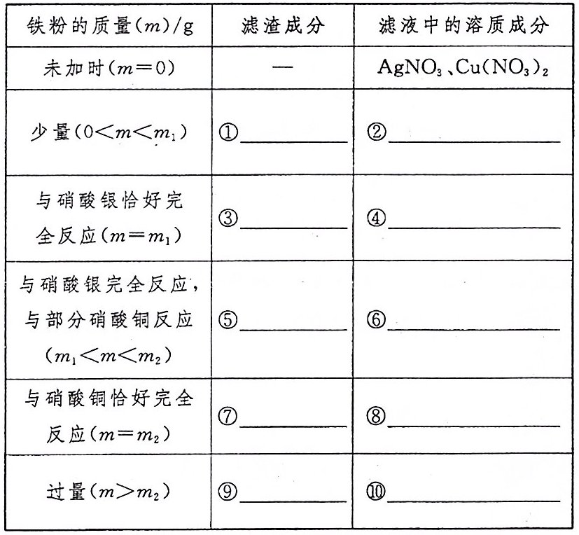 ①Ag ②Fe(NO₃)₂、Cu(NO₃)₂、AgNO₃ ③Ag ④Fe(NO₃)₂、Cu(NO₃)₂ ⑤Cu、Ag ⑥Fe(NO₃)₂、Cu(NO₃)₂ ⑦Cu、Ag ⑧Fe(NO₃)₂ ⑨Fe、Cu、Ag ⑩Fe(NO₃)₂