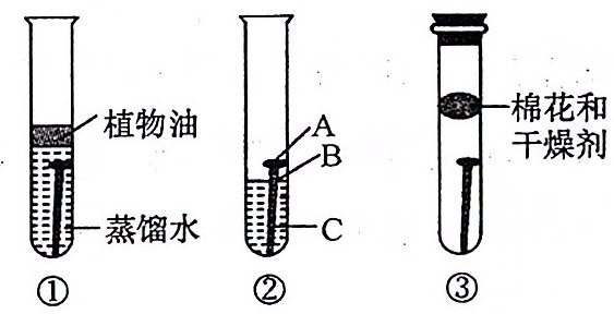 (1)一周后观察,试管①和③中的铁钉无明显变化,试管②中的铁钉明显生锈。探究发现铁生锈的主要条件是铁与________和______直接接触。②中铁钉的A、B、C三处中_____处锈蚀最严重。