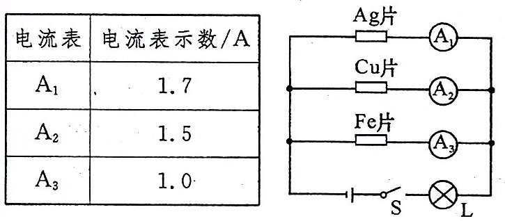 13.[跨学科融合](2024.宜宾)某学习小组为了探究不同金属导电性强弱,进行了如图所示的实验。在金属片横截面积、长度相同的情况下,测得电流数据如表。下列说法错误的是 ( )