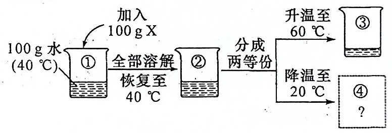 6. (2023·河北)20 ℃和60 ℃时$KCl$的溶解度分别为34.0 g和45.5 g,如图所示为对$KCl$进行的溶解实验。下列分析错误的是 ( )