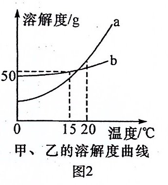 [一材多题]15 ℃时,分别向盛有100 g水的两个烧杯中,分别加入50 g的甲、乙两种固体物质,使其充分溶解,可观察到如图1所示的现象。回答8~9题。