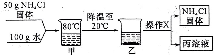 7. 氯化铵($NH_4Cl$)是农业生产中的一种肥料。80 ℃时,取50 g $NH_4Cl$固体放入100 g水中充分溶解,得到的甲溶液按如图所示进行操作。下列分析错误的是 ( )