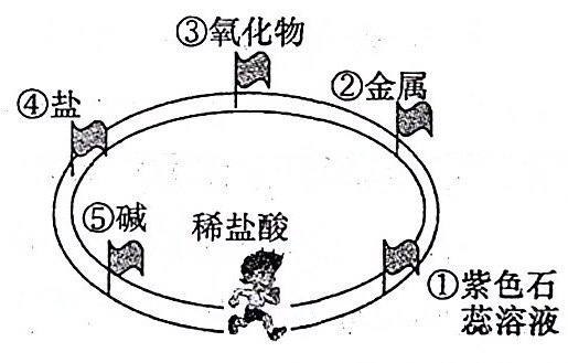 10.某学校运动会上,学生在进行化学越野赛。如图所示,某同学携带着稀盐酸逆时针奔跑,若稀盐酸分别能与各个红旗点的物质发生反应,就能跑向下一个红旗点。下列说法错误的是 ( )
