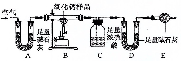 【设计并实施实验】兴趣小组设计了如图所示的实验(装置气密性良好)。取10.0g该氧化钙样品放在装置B的玻璃管中,先通入一会空气,再称量C、D装置的质量,然后边通入空气,边用酒精喷灯加热(能达到1000℃高温),至固体不再发生变化,继续通一会空气,实验后测得C装置增重0.9g,D装置增重1.1g。