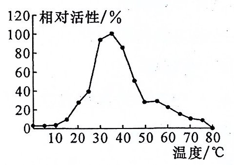 18. 苹果含有维生素A、维生素C、钾、钙、铁等人体所需的营养成分。苹果加工时容易褐变,褐变主要由于苹果中的酚类化合物在多酚氧化酶的催化下被氧化。因此,对苹果中多酚氧化酶的特性研究就显得尤为重要,温度对苹果中多酚氧化酶相对活性的影响如图。