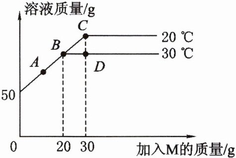 13. 在不同温度下,向盛有$50\ \text{g}$水的烧杯中缓慢加入固体$\text{M}$,测得溶液质量与加入溶质$\text{M}$质量的变化关系如图所示,试回答下列问题。
