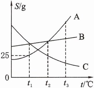 (1)$t_2℃$时,A、B、C 三种物质的溶解度的大小关系:____________________。