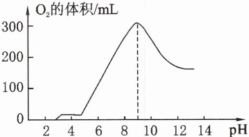 11. (2024·包头)某小组探究酸碱性对过氧化氢分解快慢的影响。60 ℃时,每次向10 g 30%过氧化氢溶液滴加调节剂,使溶液的pH从3依次调至13,测得30分钟内产生气体的体积随pH的变化关系如图。下列分析正确的是 ( )