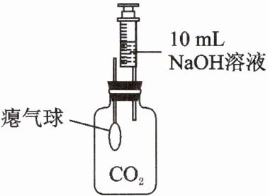 $2NaOH + CO_2 = Na_2CO_3 + H_2O$ 气球逐渐变大 随着反应的逐渐进行,广口瓶中的二氧化碳逐渐减少,瓶中的气压减小。 二氧化碳溶于水,也会使二氧化碳气体减少,广口瓶中的气压减小,导致气球变大 用相同的装置,用注射器将等体积的水推入广口瓶中做对比实验(合理即可)
