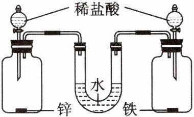 (2)兴趣小组按如图所示装置(气密性良好)进行实验。两个广口瓶中分别放有0.2 g的锌和铁,U形管两端液面相平,将等体积的足量稀盐酸同时加入广口瓶中,关闭活塞。反应结束,恢复至室温,U形管两端液面____________(填“左高右低”“左低右高”或“相平”)。