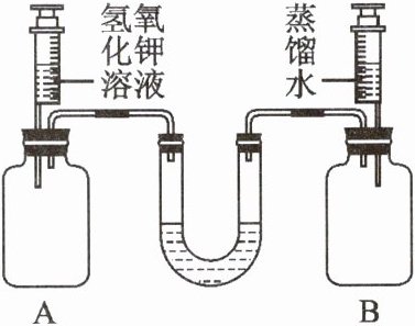 ②为验证猜想,进行实验探究(如图所示):向A、B两个相同规格且充满COsub>2/sub>的瓶中分别注入等体积的氢氧化钾溶液和蒸馏水,充分反应后放在水平桌面上(U形管内为红墨水),观察到____________________现象,则猜想正确。