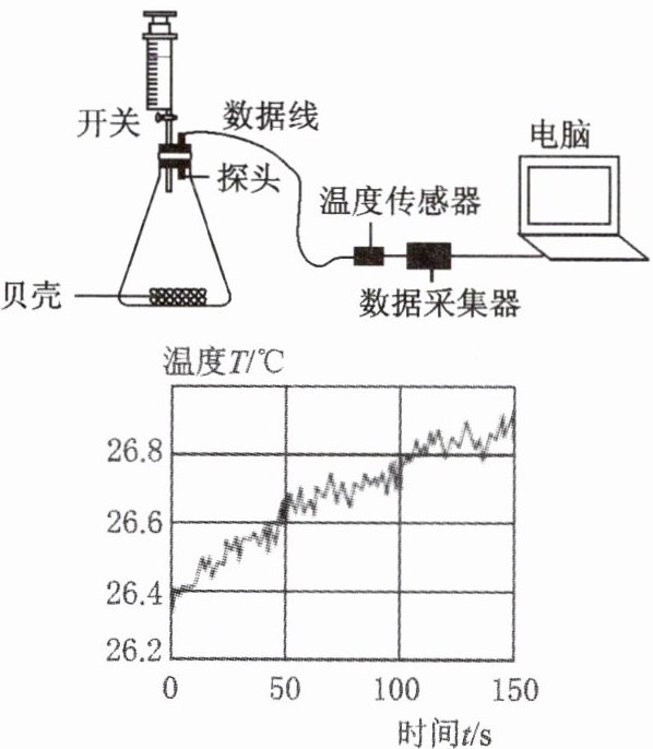 将贝壳洗净、干燥、并研磨成粉末后放入上图所示的锥形瓶中,通过注射器注入稀盐酸,借助数字化实验仪器采集数据。