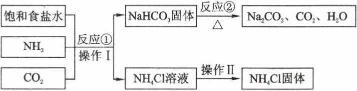 $NH_{3}$ 反应① 操作Ⅰ $NaHCO_{3}$固体 反应② $Na_{2}CO_{3}$、$CO_{2}$、$H_{2}O$