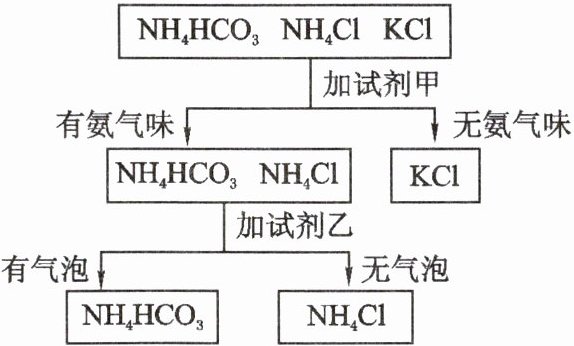 11. 如图是鉴别$NH_{4}HCO_{3}$、$NH_{4}Cl$、$KCl$三种化肥的过程,试剂甲和乙分别可能是 ( )