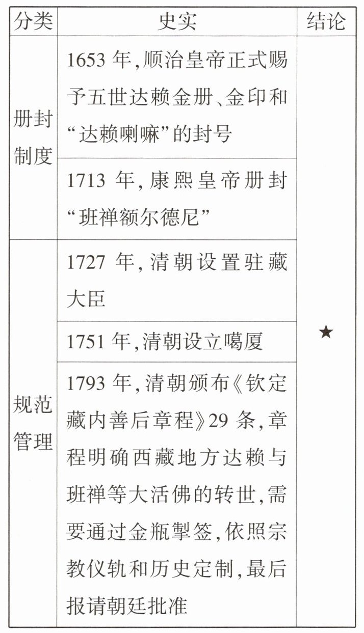 (三)表格一:清朝的这些措施,有效地加强了对西藏的管辖。说明整个西藏都是在中国主权管辖范围内,西藏的一切无不听命于朝廷。因此西藏地区自古以来就是我国领土不可分割的一部分。
