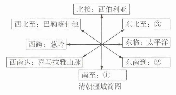 阅读清朝疆域简图,请将①②③处填充完整。