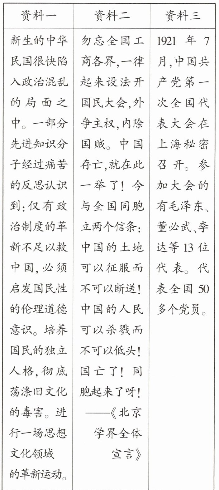 (2) 根据材料二并结合所学知识作答:资料一反映的“部分先进知识分子进行的思想文化领域革新的运动”具体指哪一活动? 资料二的宣言出现在哪次运动中? 写出与材料一、二有关的“两次运动”的内在关联。