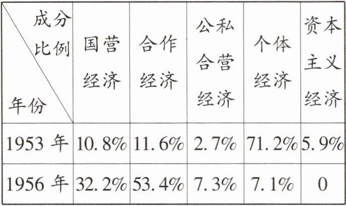 (3)结合所学知识指出材料二中1953年到1956年各种经济成分变化的直接原因是什么?