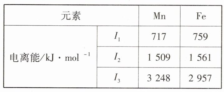 比较表中 Mn、Fe 两元素的$I_2$、$I_3$可知,气态 Mn²⁺再失去一个电子比气态 Fe²⁺再失去一个电子________(填“易”或“难”)。你的解释是______________________________。