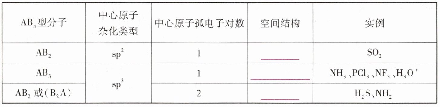 2. 当杂化轨道中有未参与成键的孤电子对时,孤电子对对成键电子对的排斥作用,会使分子或离子的空间结构与杂化轨道的形状有所不同。