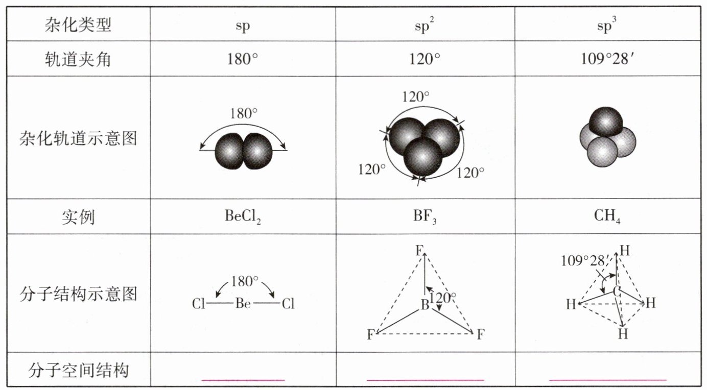 1. 当杂化轨道全部用于形成 $\sigma$ 键时,分子或离子的空间结构与杂化轨道的空间结构相同。