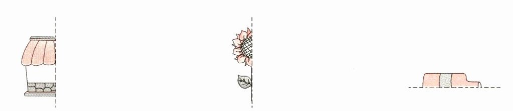 4.把镜子放在虚线上,看看下面三幅图的整个图形是什么,写在下面的括号里。(6分)