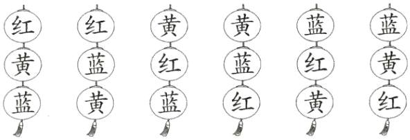 1.[新角度]用红色、黄色、蓝色三种颜色的灯笼各一个挂成一串,有( )种不同的挂法。拿出你的彩笔涂一涂。(6分)