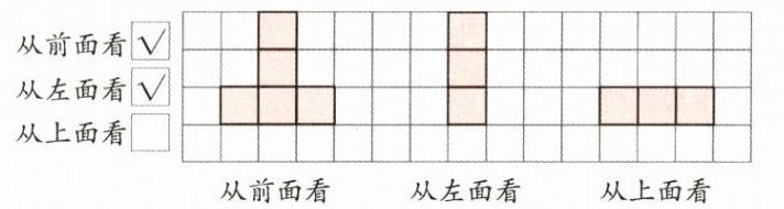 (2)[新题型]如果在小正方体①的上面再添上一个同样大的小正方体,那么从哪些面看到的图形发生了变化?请你在相应的 里画“√”,并把变化后看到的图形画在下面的方格纸中。