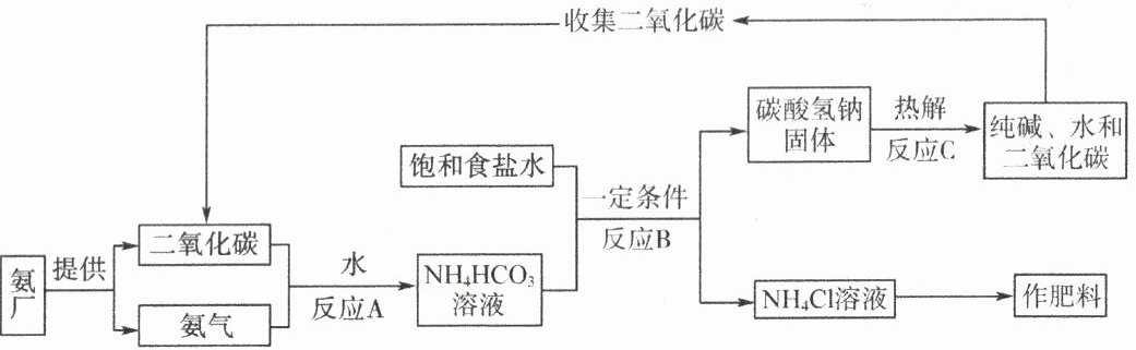 B.反应 B 的化学方程式是 NaCl + NH_4HCO_3 ${\xlongequal{一定条件}}$ NaHCO_3 + NH_4Cl