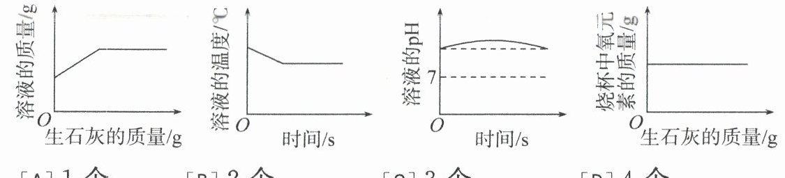 4. (2023·重庆 A 卷)向盛有饱和石灰水的烧杯中逐渐加入少量生石灰(忽略水的挥发和 $ CO_2 $ 的影响)。下列图像不正确的有 (