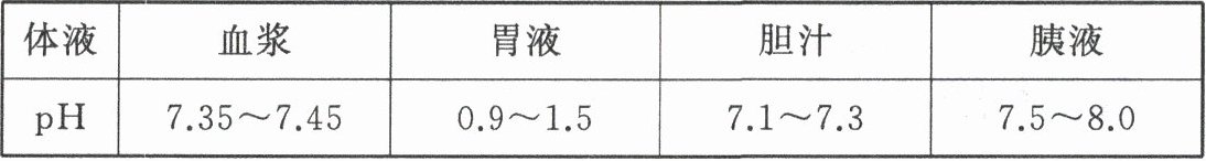 2. 人体内几种体液的正常 $ pH $ 的范围如表所示: