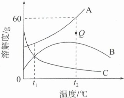 (2)$t_2℃$时,Q 点代表_________(填字母序号,下同)物质溶液处于不饱和状态。
