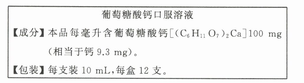 (4)钙是人体内含量最高的金属元素,是构成人体的重要组分。缺钙者可以在医生的指导下口服葡萄糖酸钙溶液来补钙。如图所示为某品牌“葡萄糖酸钙口服溶液”的部分说明。