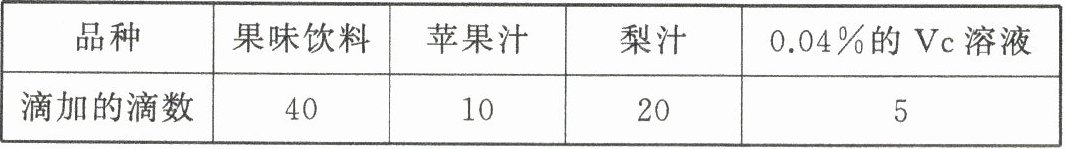 【设计方案】分别向盛有 1 mL 等浓度高锰酸钾稀溶液的四支试管中逐滴滴加果味饮料、苹果汁、梨汁和 0.04%的 Vc 溶液,边滴加边振荡,直至高锰酸钾溶液褪色。