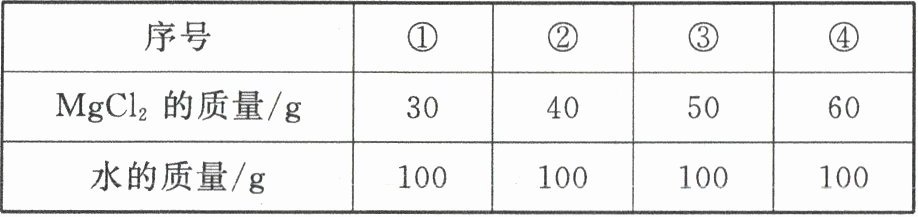 5. (1分)用 $MgCl_{2}$ 溶液喷洒路面可融雪、防尘。 $20^{\circ}C$ 时,按如表所示的数据配制溶液,所得到的溶液中,溶质与溶剂的质量比