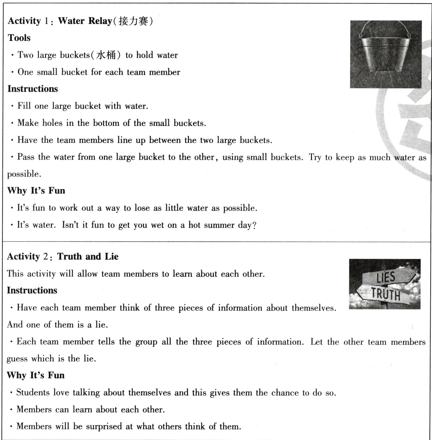 It is necessary for students to learn some team skilIls like developing relationships,communicating well with others and solving problems.Here are two fun team activities.