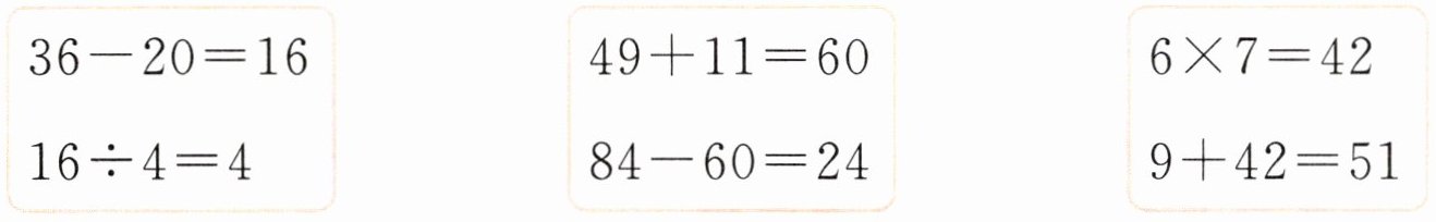 (36 - 20)÷4 = 4 84 - (49 + 11) = 24 9 + 6×7 = 51