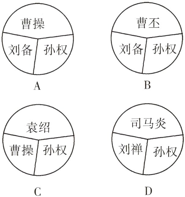 6.东汉末年群雄并起,最终形成三国鼎立的格局。下列示意图符合公元222年三国局势的是( )