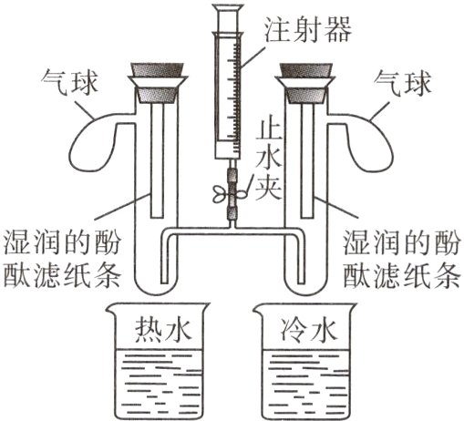 (3)立即将装置下端两试管底部同时浸入装有等体积的热水和冷水的烧杯中,发现________(填“左侧”或“右侧”)试管内湿润的酚酞滤纸条变红的速率加快,说明温度对微粒的运动速率产生了影响。