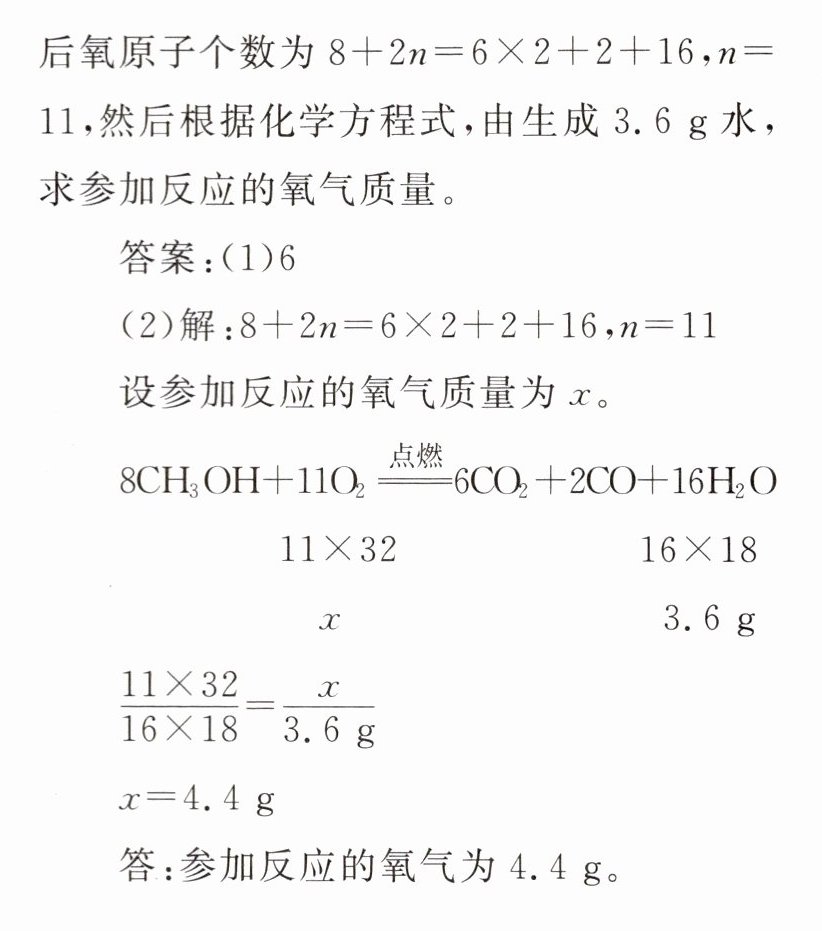 例4甲醇($CH_{3}OH$)是一种有毒、有酒的气味的可燃性液体。甲醇在氧气中不完全燃烧,可发生如下反应:$8CH_{3}OH + nO_{2}\stackrel{点燃}{=\!=\!=}mCO_{2}+2CO + 16H_{2}O$。若反应生成3.6 g水,请计算: