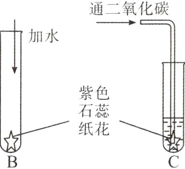 (2)在B实验中,当加入水后,紫色石蕊纸花显____________色,B实验的作用是______________________________。