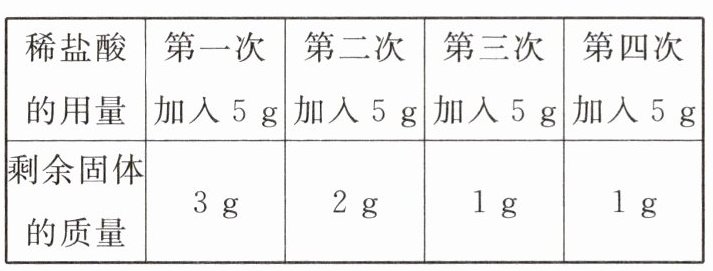 (2)解:由表中数据可知第三次加入 5 g 稀盐酸后,3 g 碳酸钙与 15 g 稀盐酸刚好完全反应。