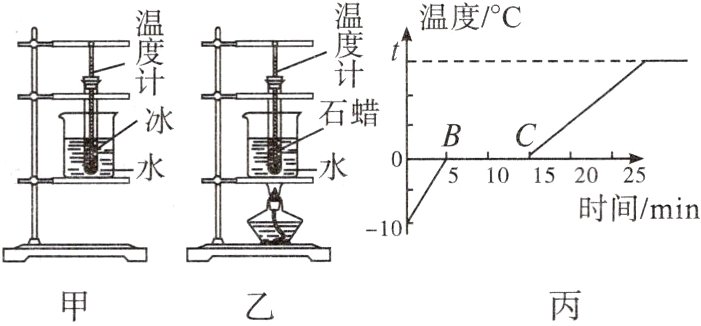 29. 小明同学利用如图甲、乙所示装置进行探究“冰和石蜡熔化特点”的实验,冰熔化过程中,温度随时间变化图像如图丙所示。(烧杯中水的初温和环境温度为15℃)