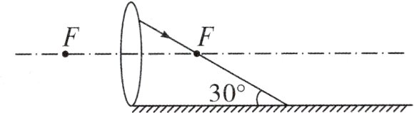 例4如图所示,一束光射向凸透镜经折射后,折射光线射到一个平面镜上。请在图中画出射向凸透镜的这束入射光和经平面镜反射的光路,并标出反射角的度数。