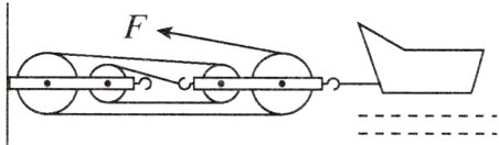 33.某人站在岸上利用滑轮组使停泊在水中的船匀速靠岸,已知滑轮组由两个定滑轮和两个动滑轮组成(滑轮重不计),如图所示,船重1.02×10⁵N,船移动时受到水的阻力是船重的$\frac{1}{100}$,人水平拉绳的力为240N,船靠岸的速度为0.72km/h。求: