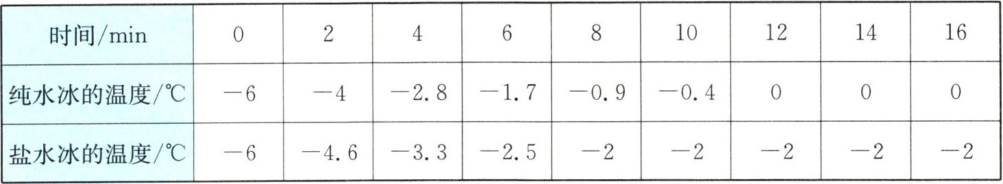 | 盐水冰的温度/℃ | -6 | -4.6 | -3.3 | -2.5 | -2 | -2 | -2 | -2 | -2 |