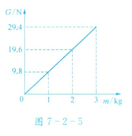 12. 在探究物体所受的重力与物体质量大小的关系时,获得了几组数据,将这些数据绘制成如图7-2-5所示的图像,请分析图像并得出结论。